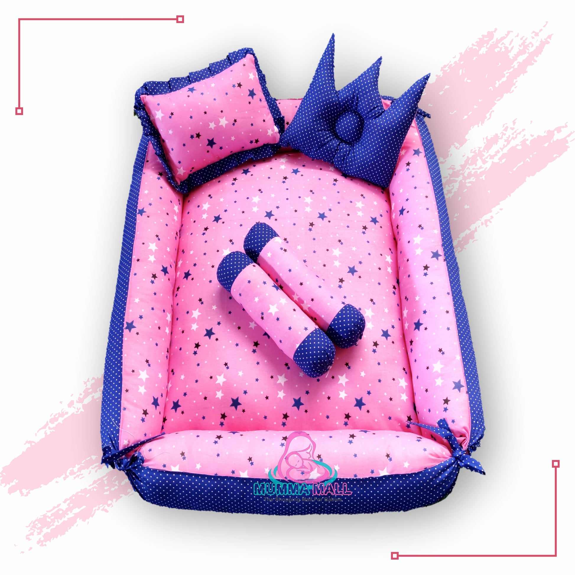 Baby box mattress set with set of 4 pillows as neck support, side support and toy (Pink and Blue)