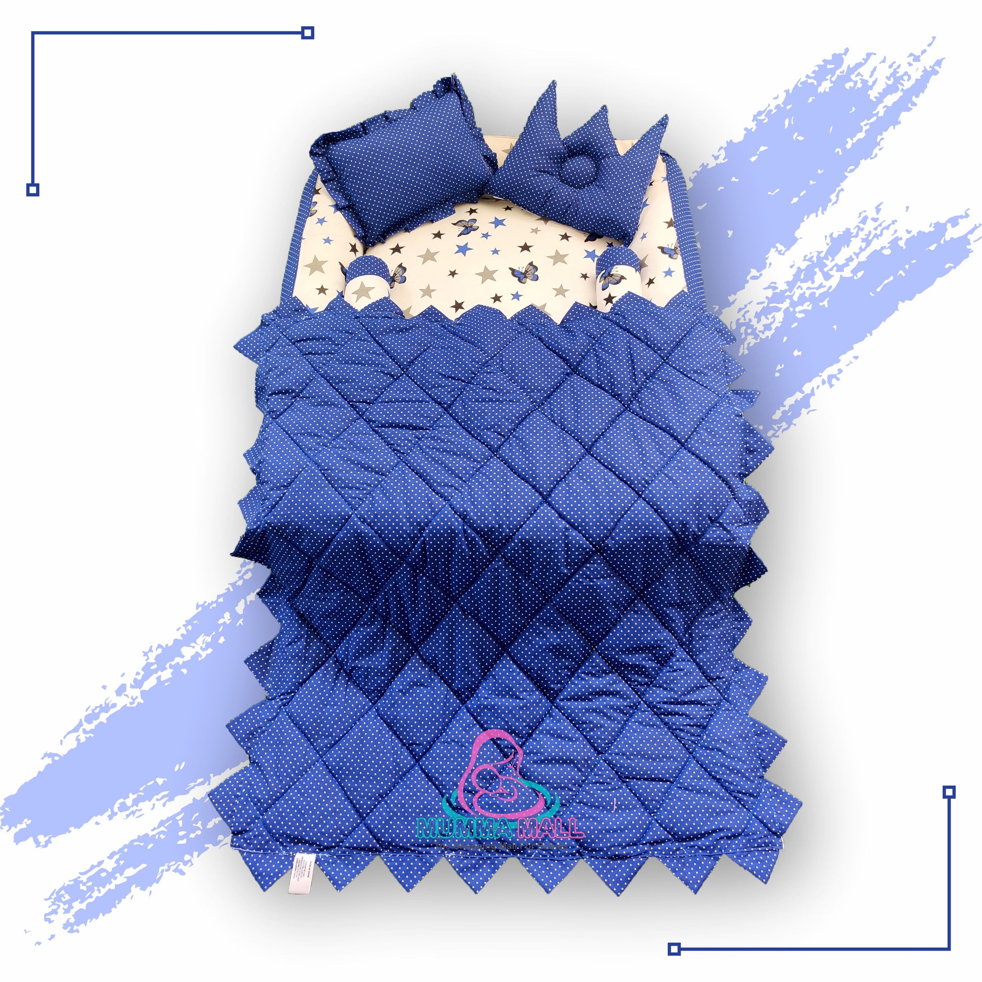 Baby box mattress with blanket and set of 4 pillows as neck support, side support and toy (Blue and White)