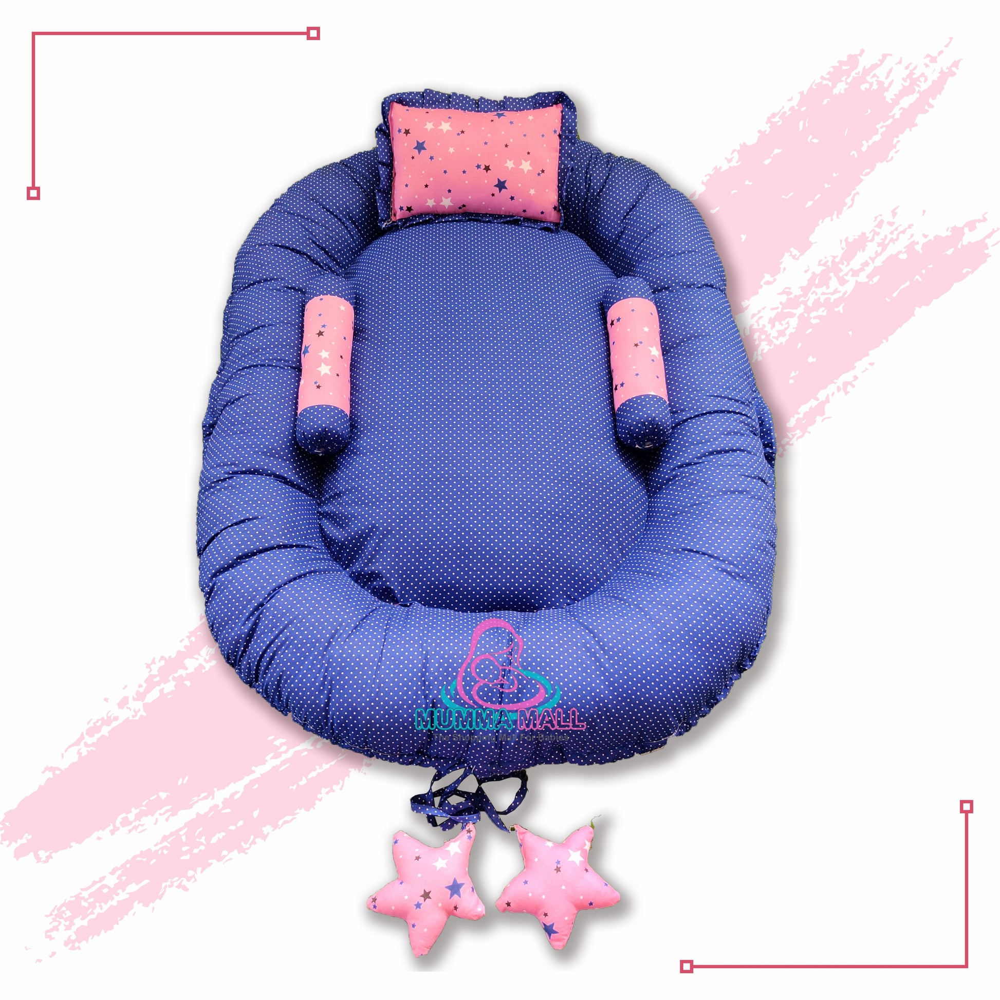 Baby nest bedding set with set of 3 pillows as neck support, side support and toy (Pink and Blue)