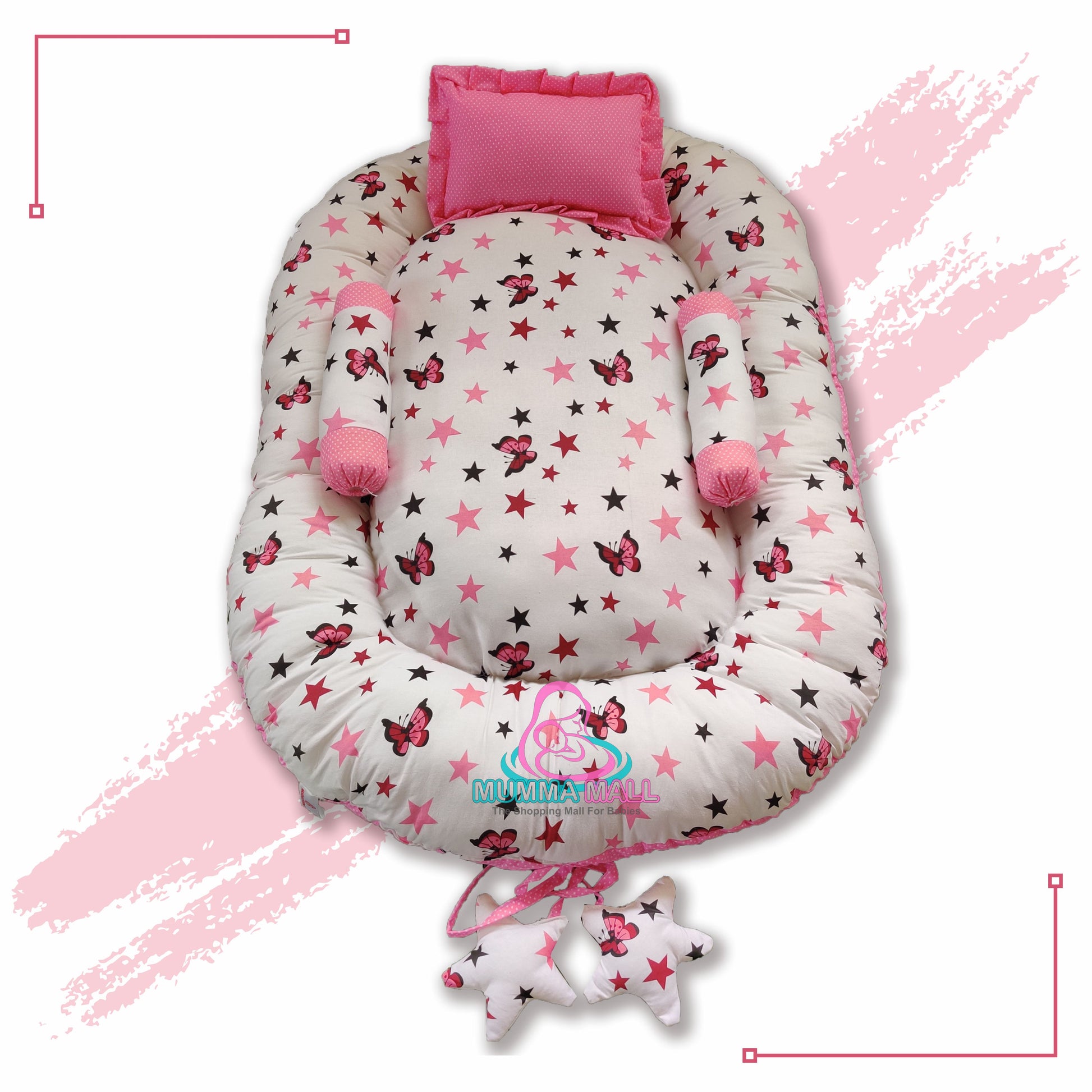 Baby nest bedding set with set of 3 pillows as neck support, side support and toy (Pink and White)