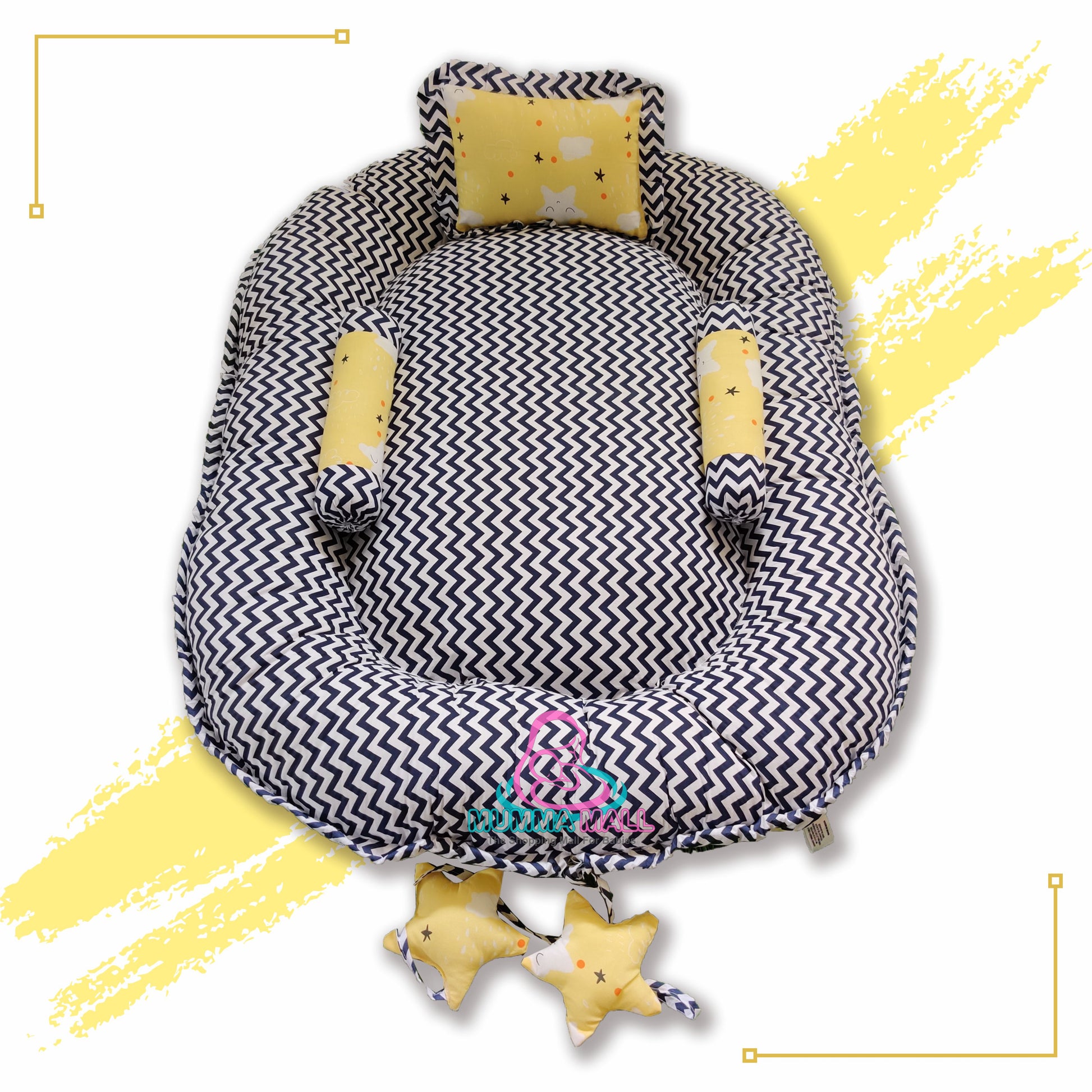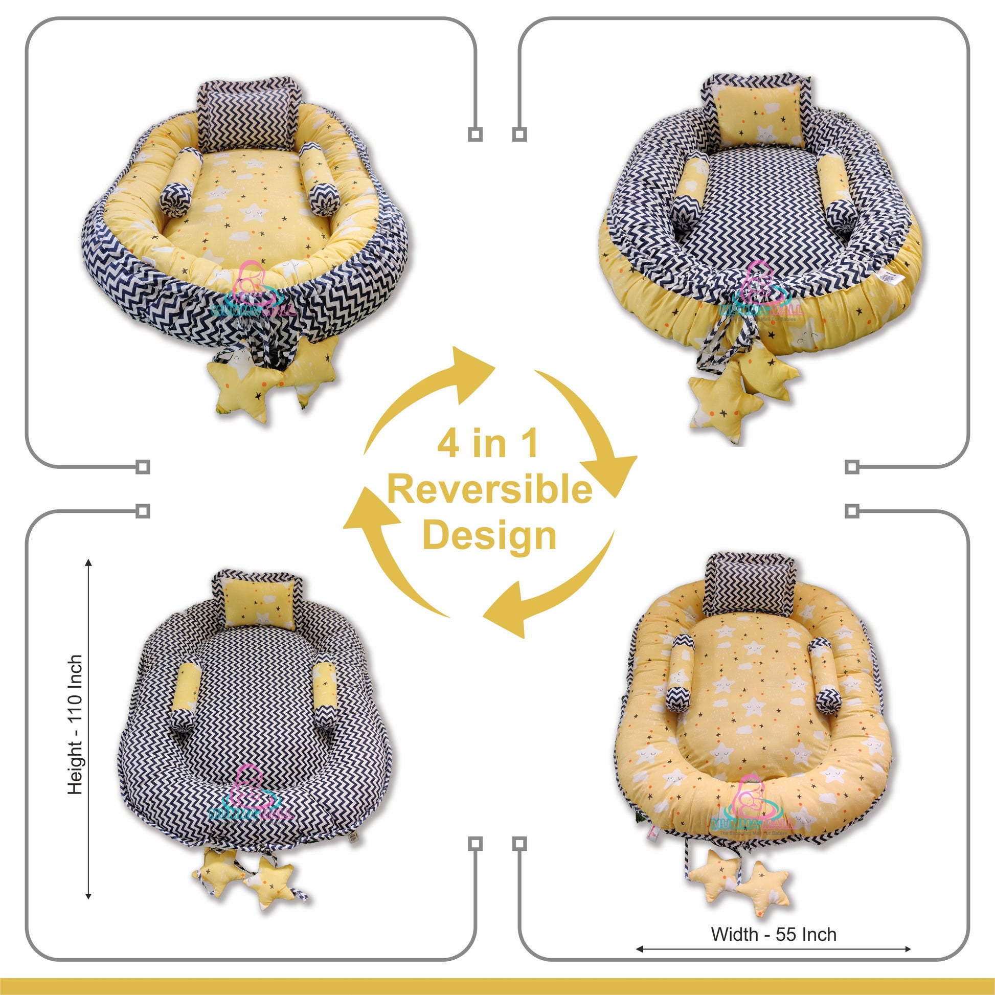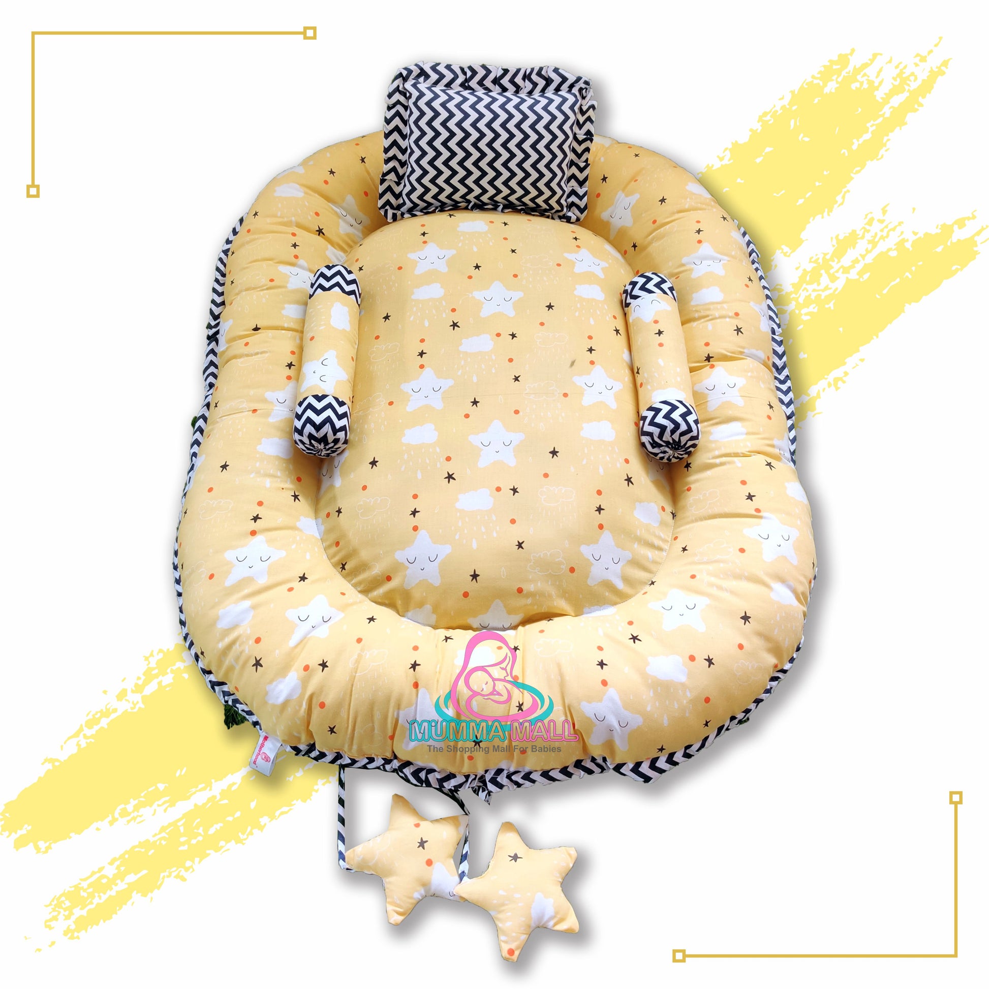 Baby nest bedding set with set of 3 pillows as neck support, side support and toy (Yellow and Black)