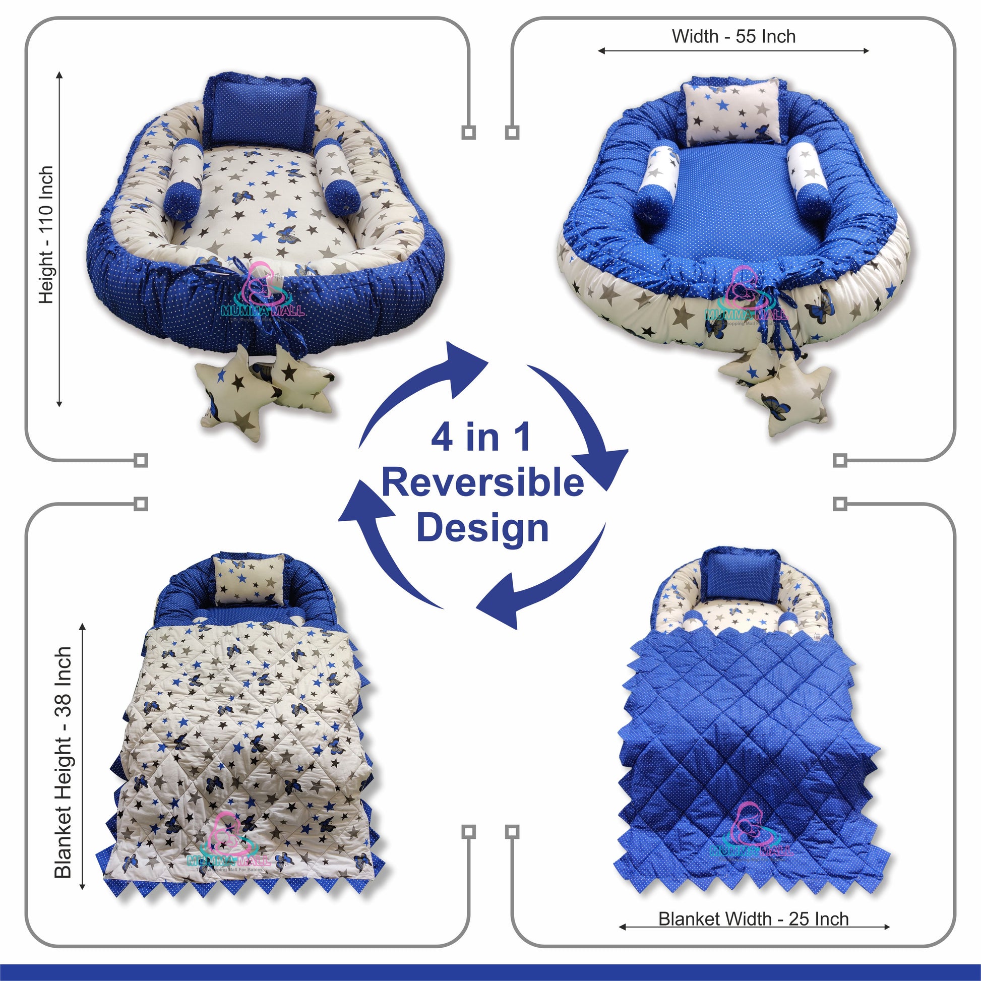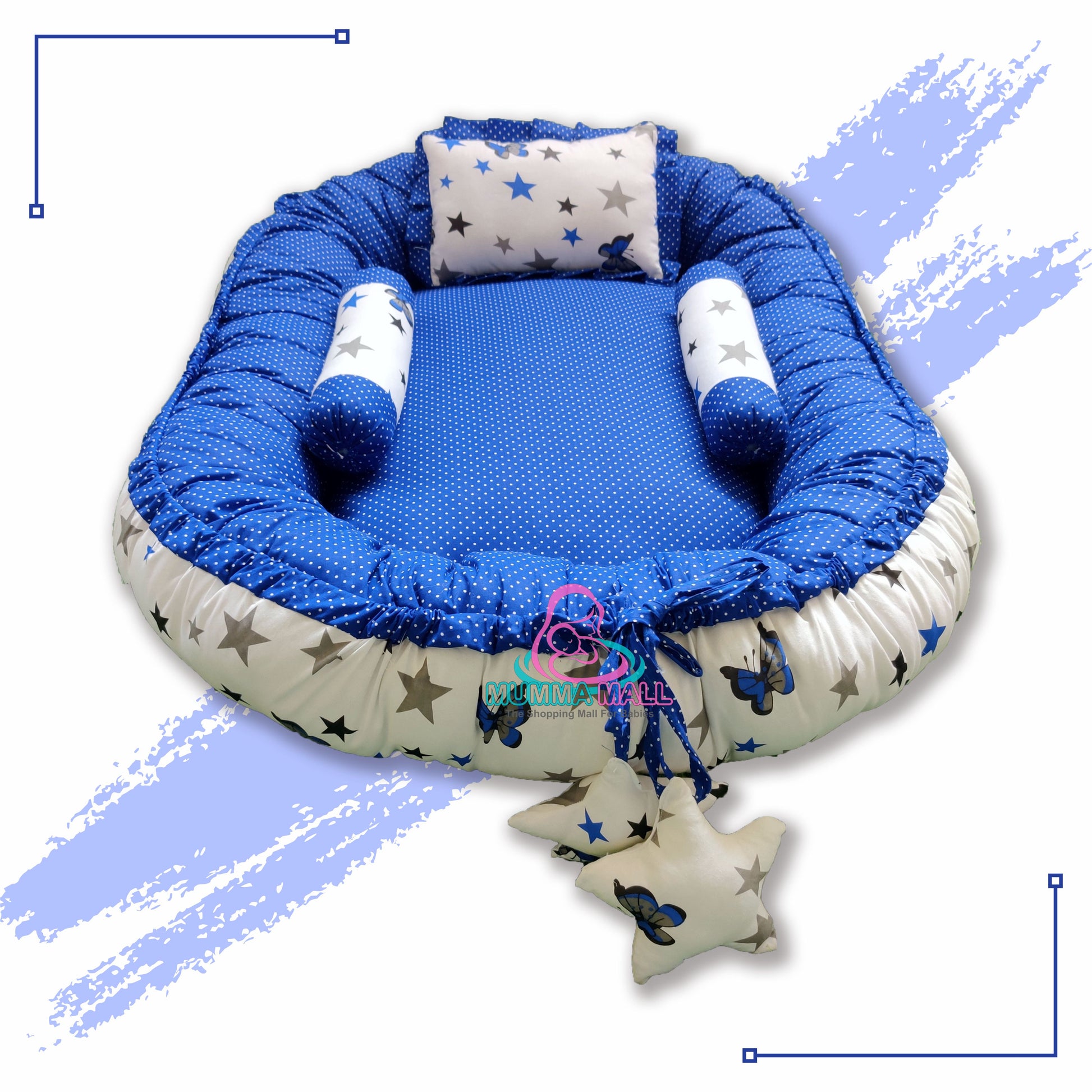 Baby nest bedding with blanket and set of 3 pillows as neck support, side support and toy (Blue and White)