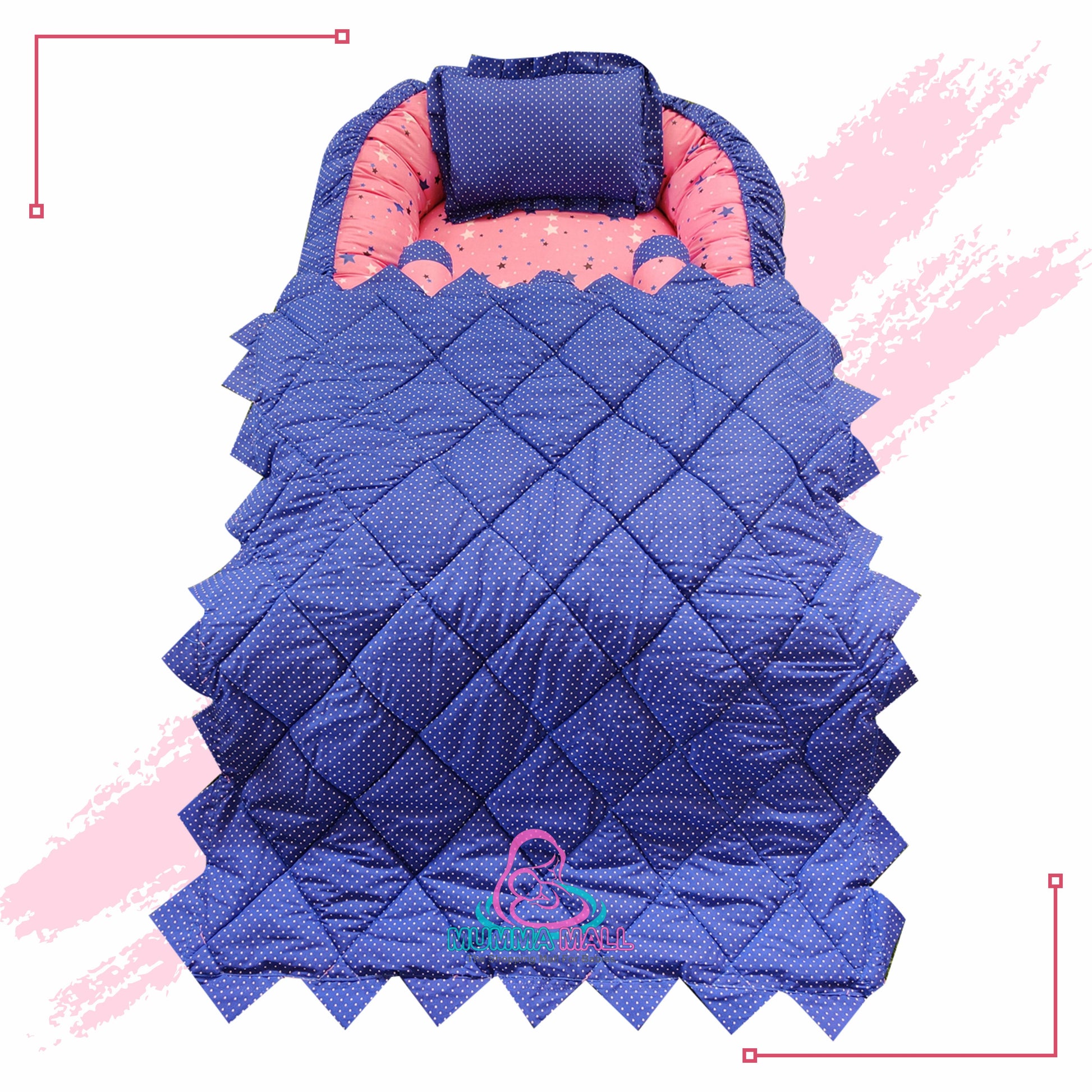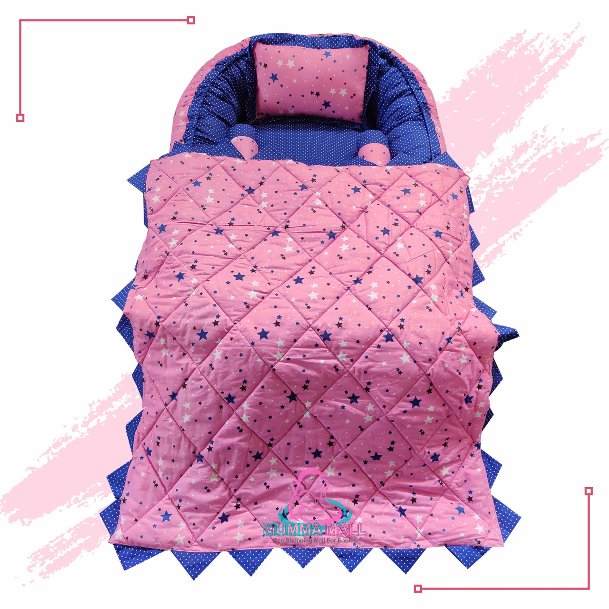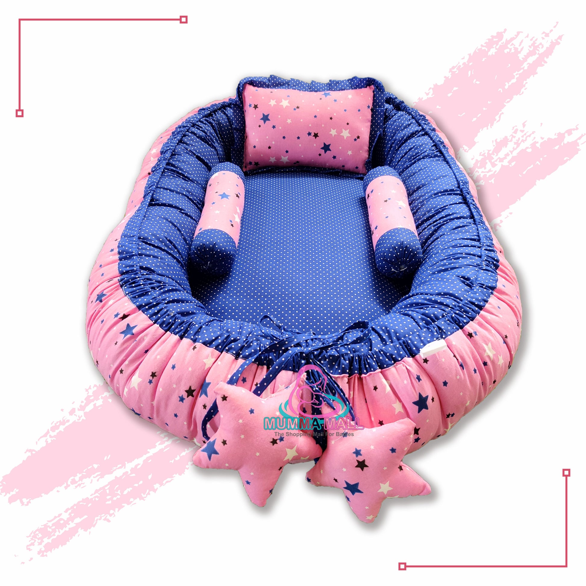 Baby nest bedding with blanket and set of 3 pillows as neck support, side support and toy (Pink and Blue)
