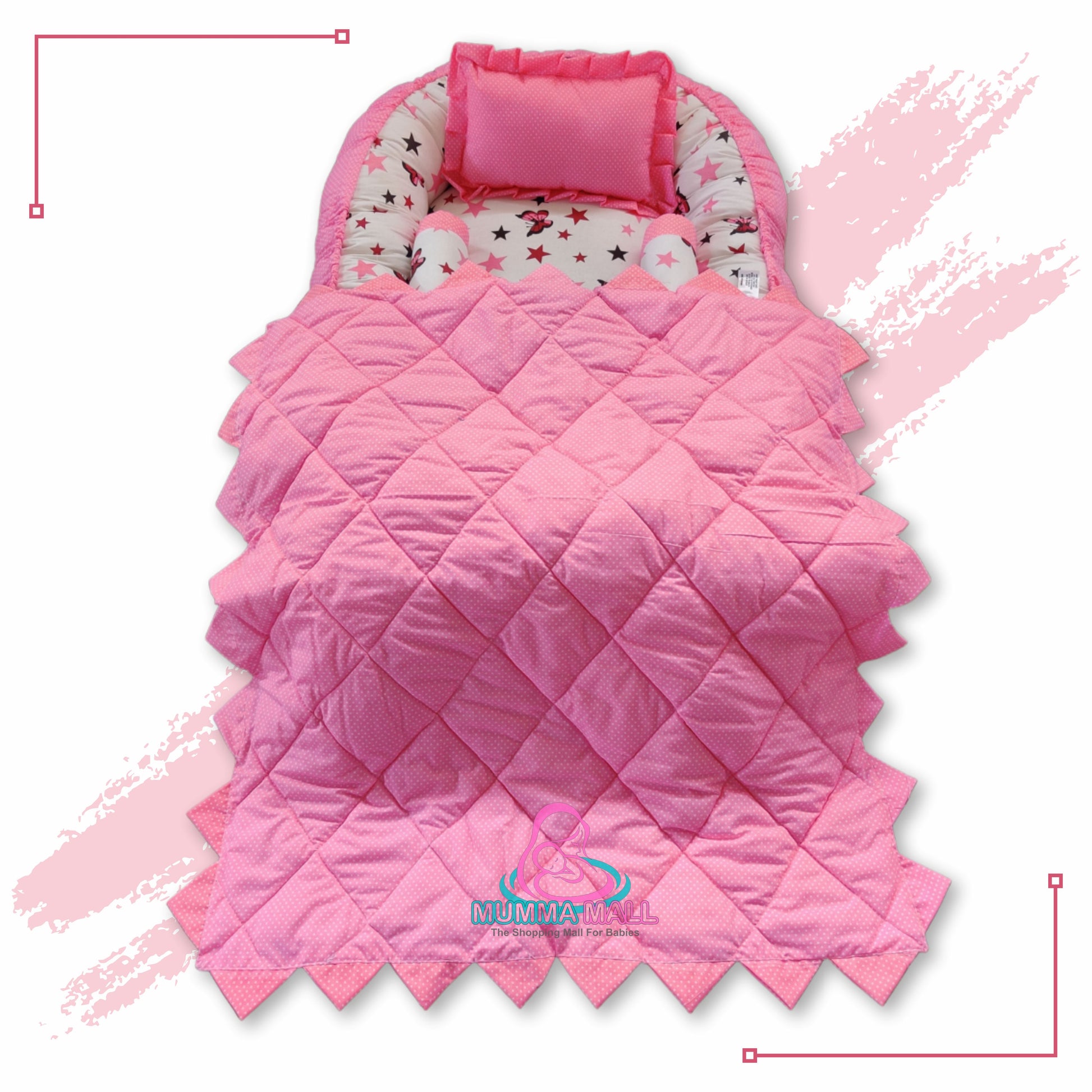 Baby nest bedding with blanket and set of 3 pillows as neck support, side support and toy (Pink and White)