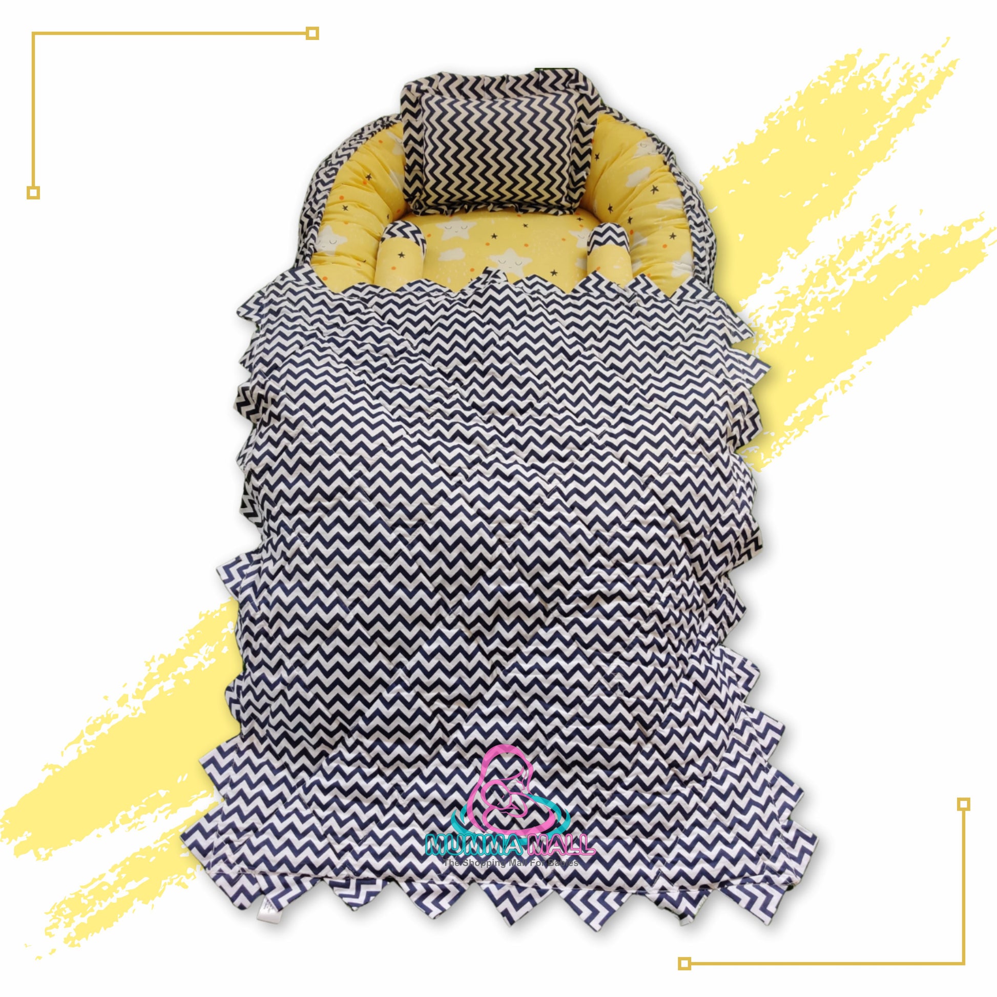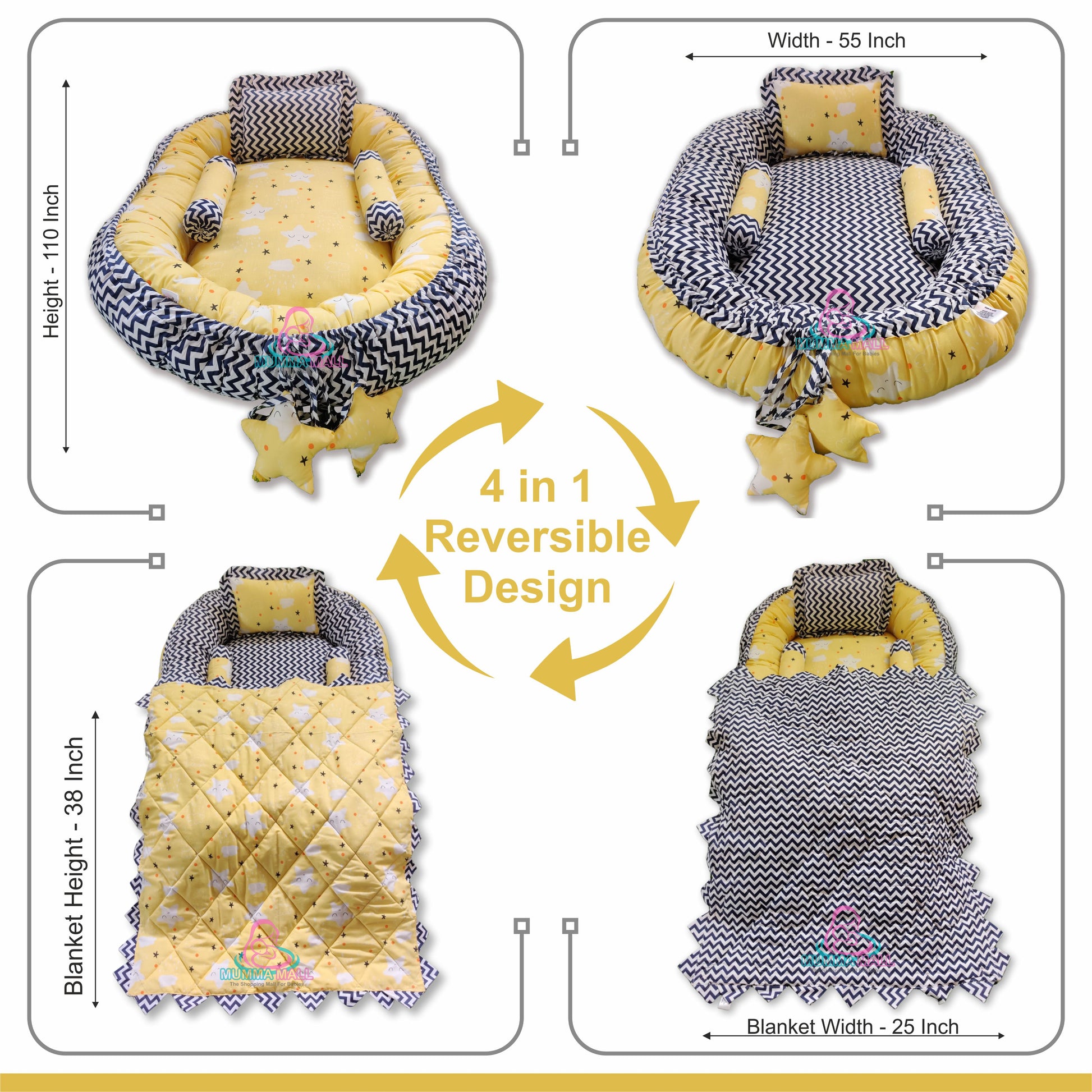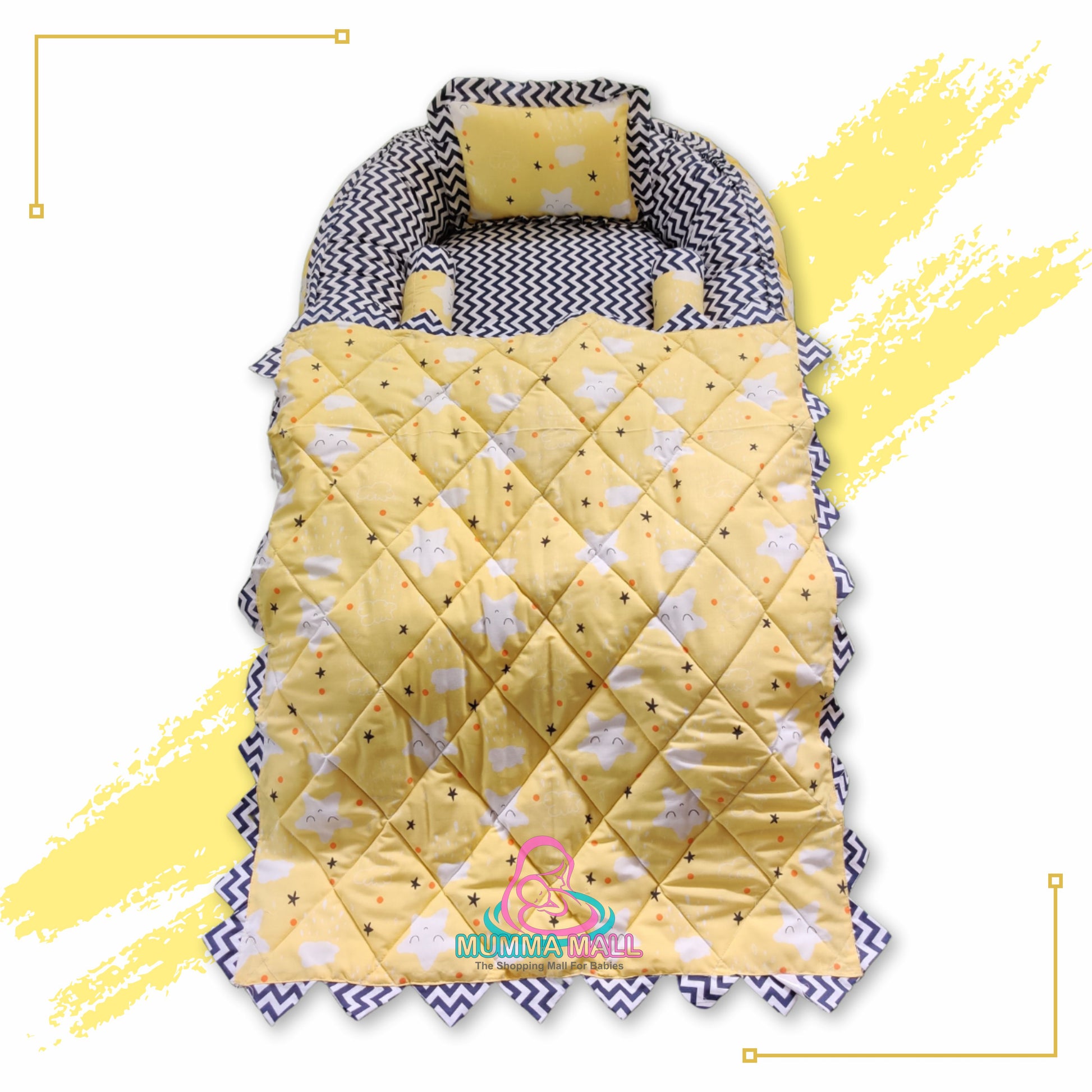 Baby nest bedding with blanket and set of 3 pillows as neck support, side support and toy (Yellow and Black)