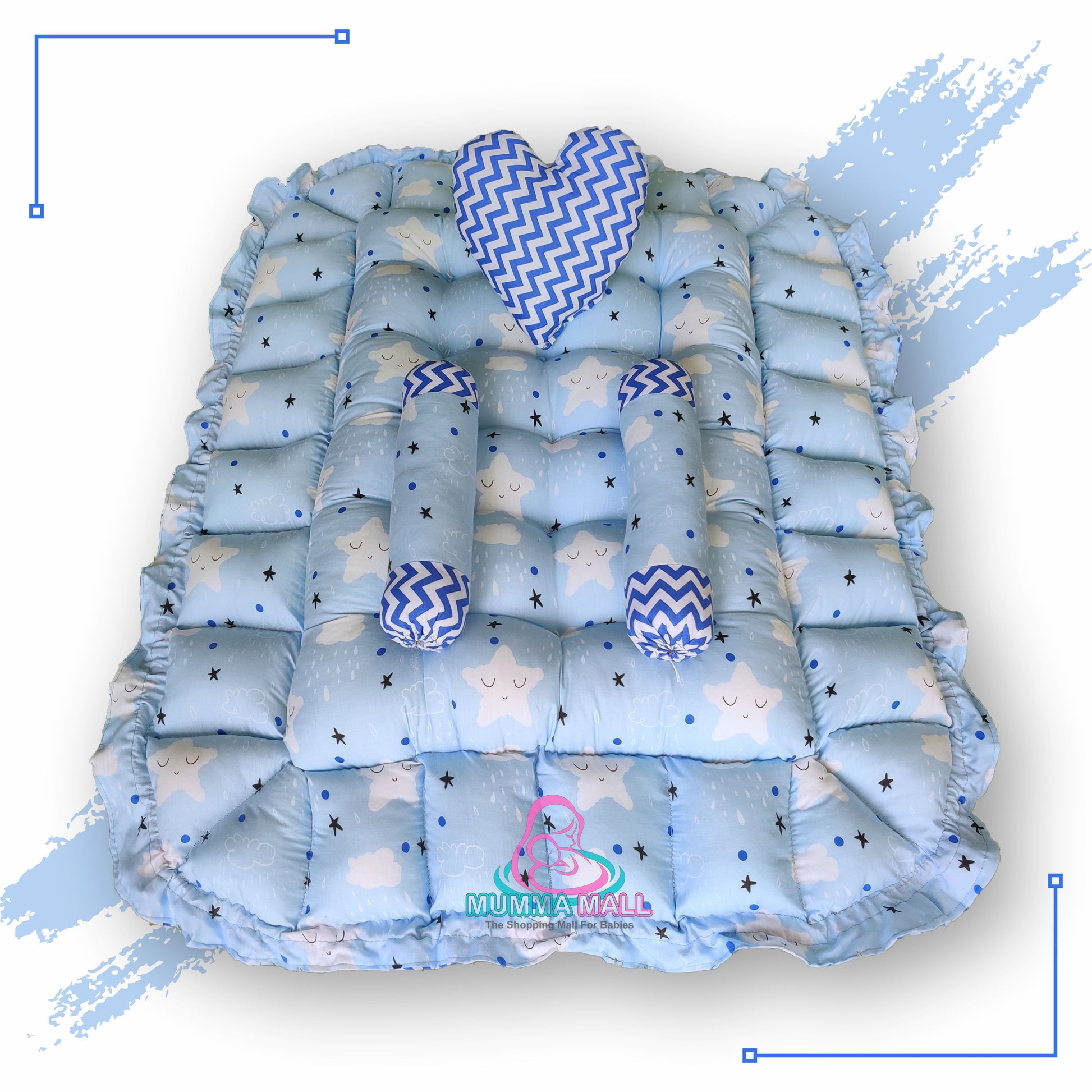 Rectangle baby tub bed with a heart pillow and pair of Bolster (Sky and Blue)