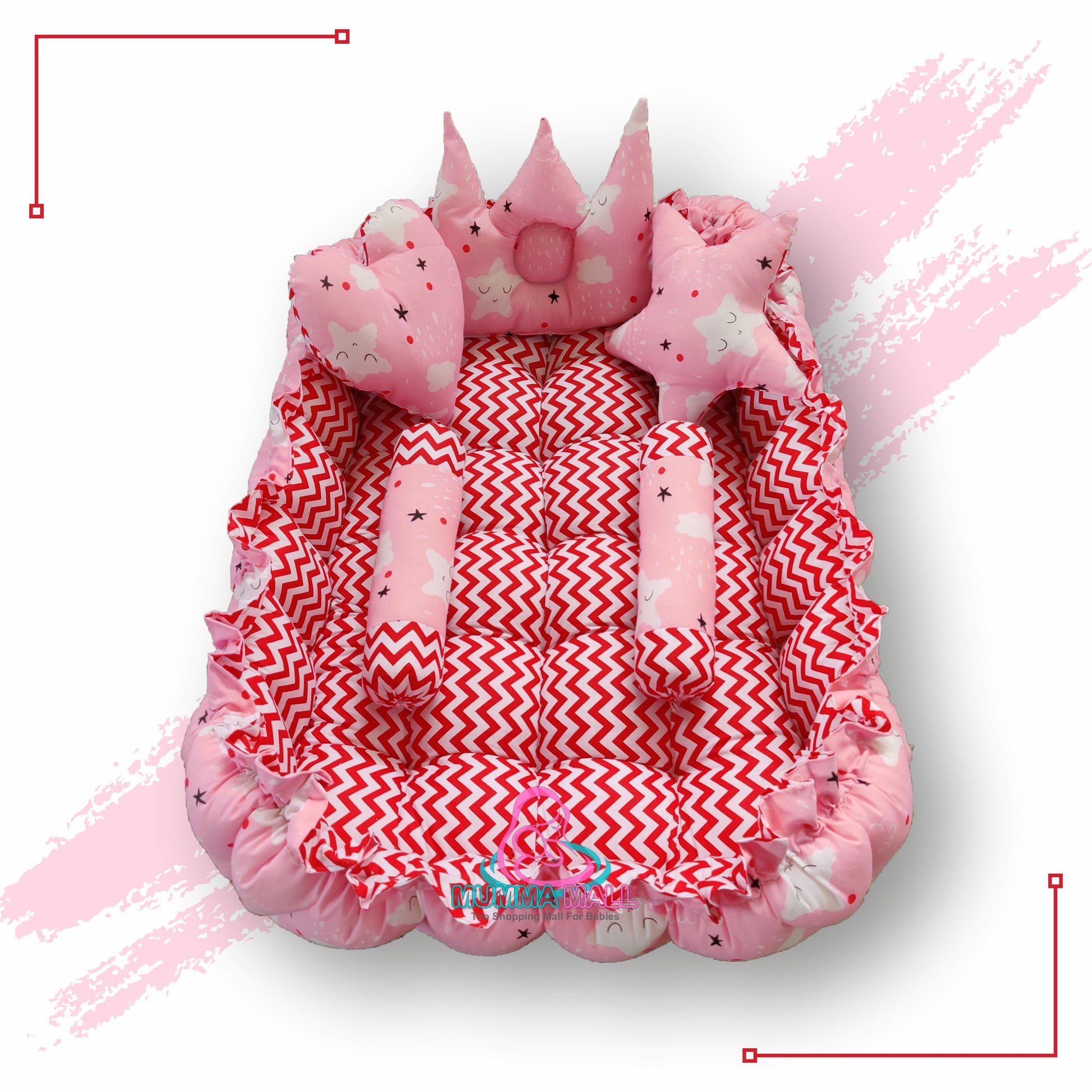 Rectangle baby tub bed with blanket and set of 5 pillows as neck support, side support and toy (Pink and Red)