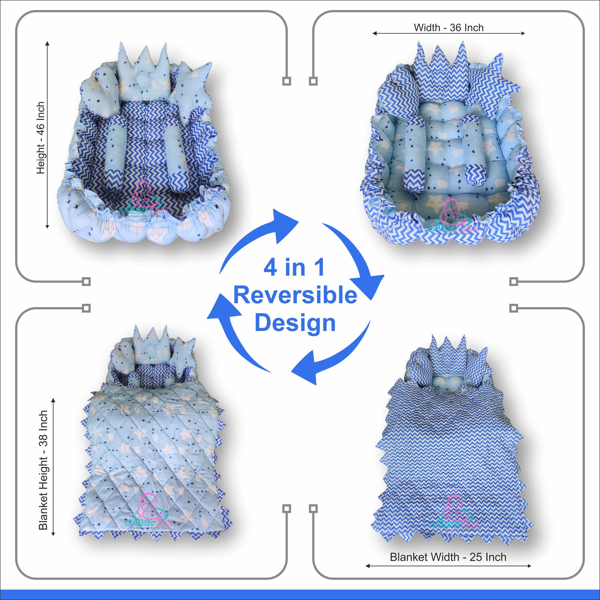 Rectangle baby tub bed with blanket and set of 5 pillows as neck support, side support and toy (Sky and Blue)
