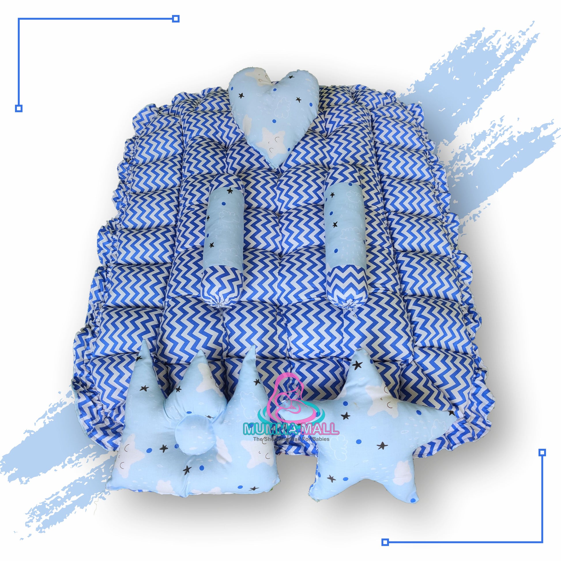Rectangle baby tub bed with with set of 5 pillows as neck support, side support and toy (Sky and Blue)