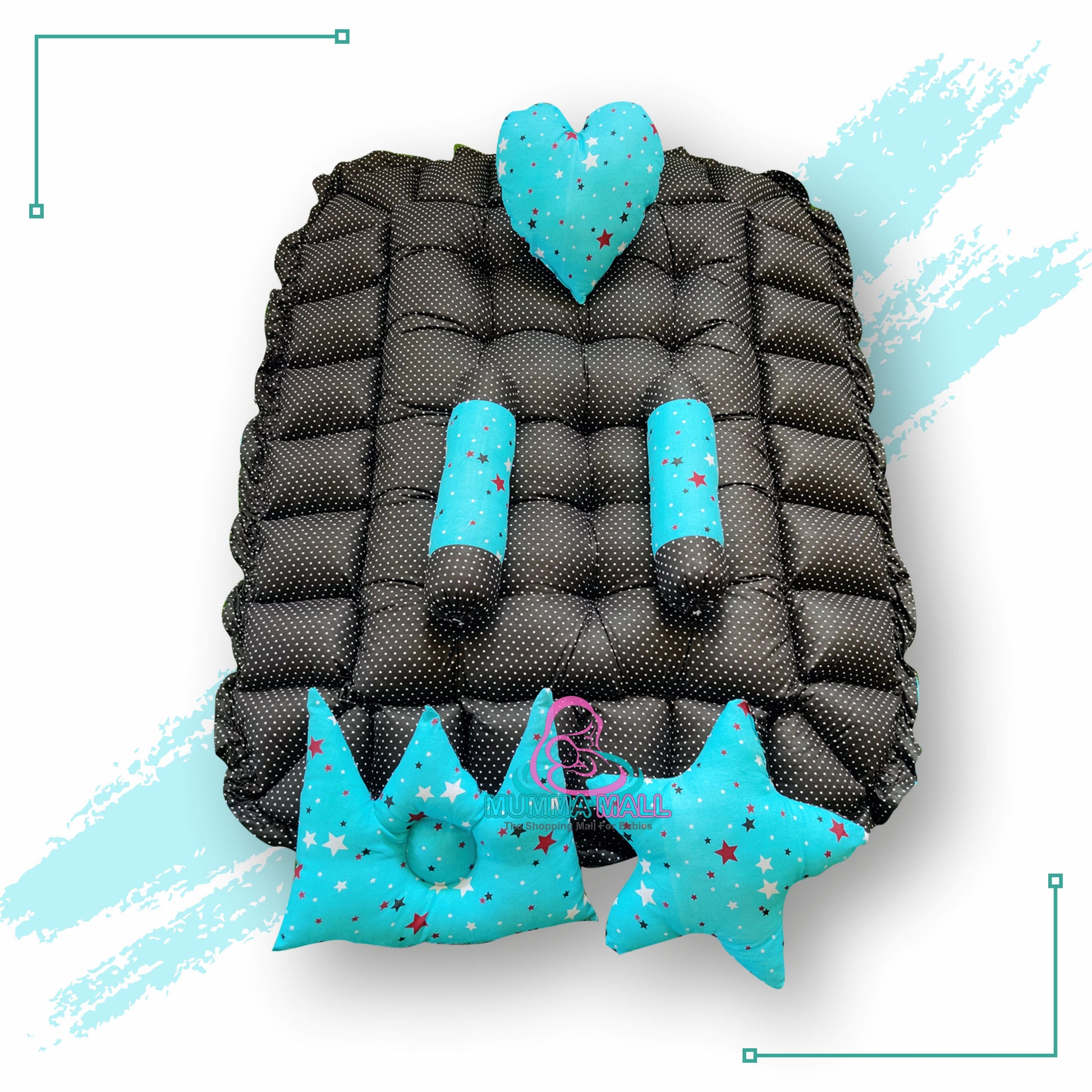 Rectangle baby tub bed with with set of 5 pillows as neck support, side support and toy (Turquoise and Black)