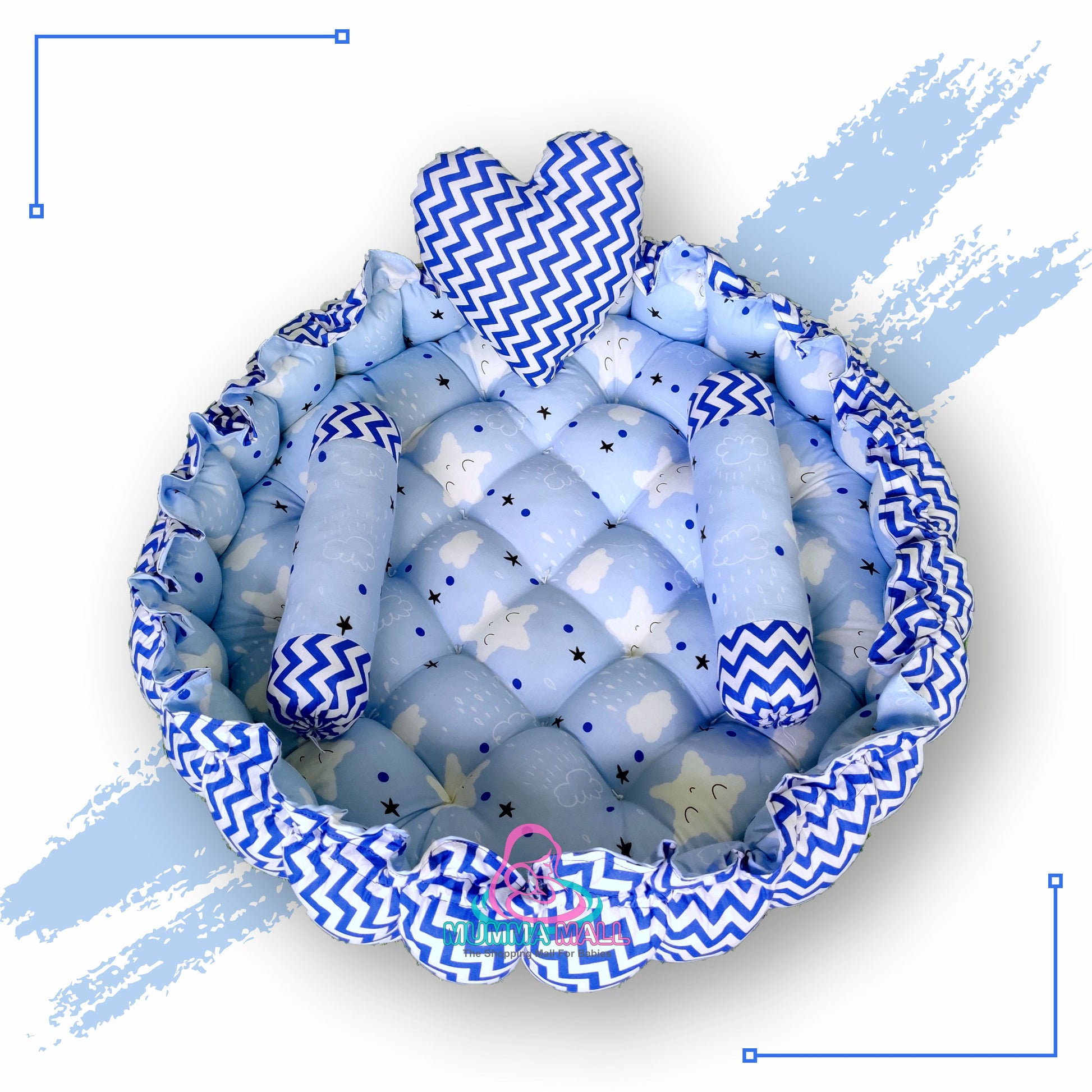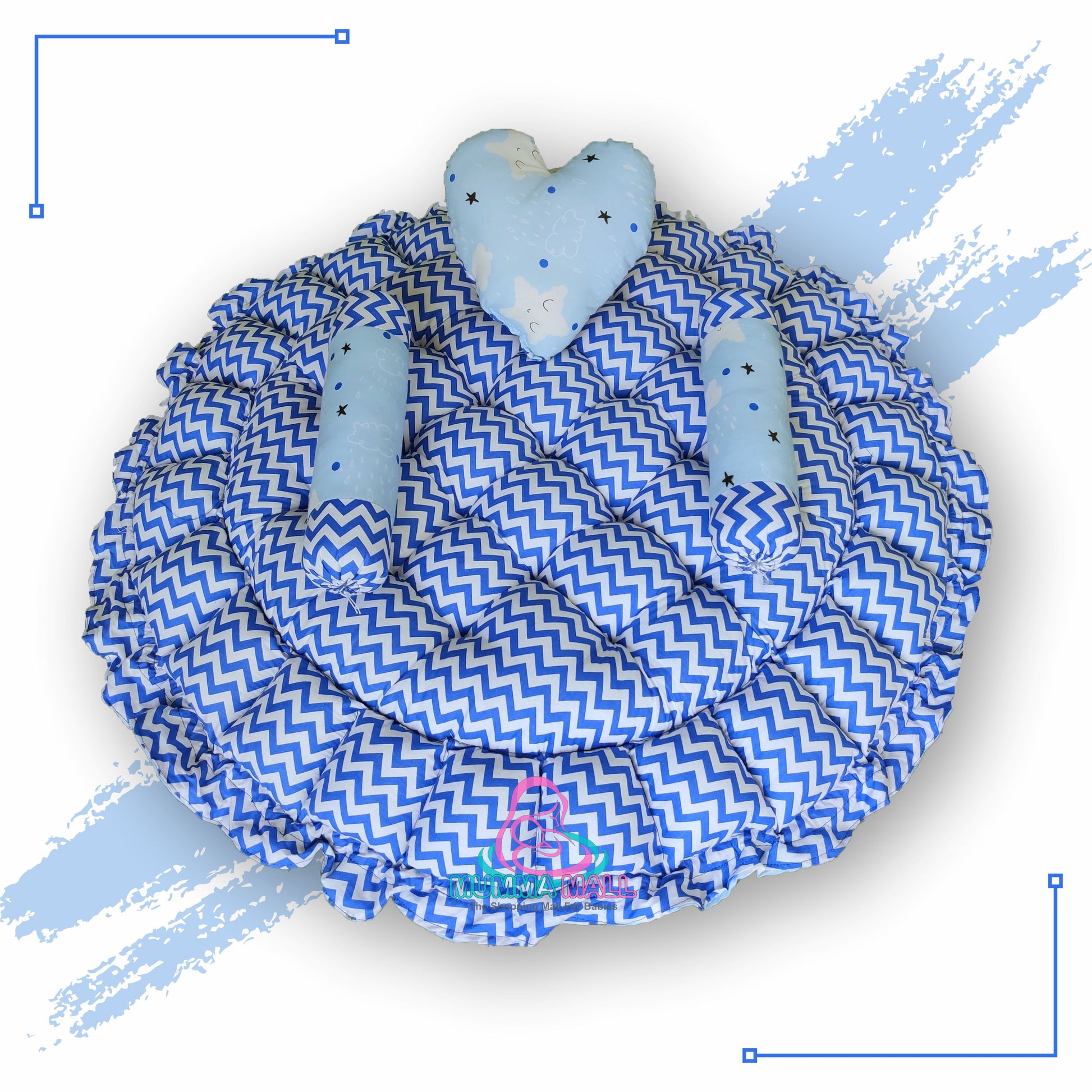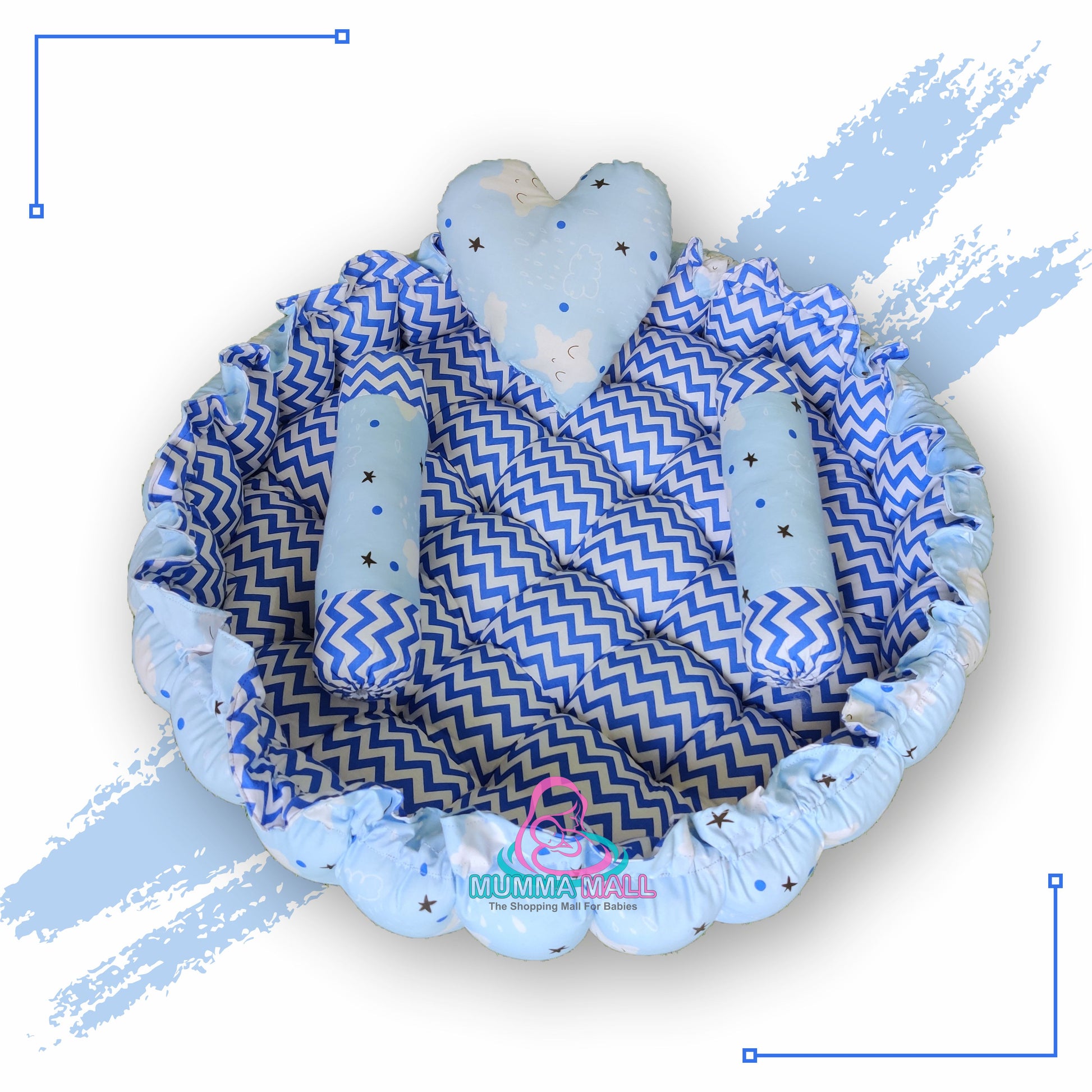 Round baby tub bed with a heart pillow and pair of Bolster (Sky and Blue)
