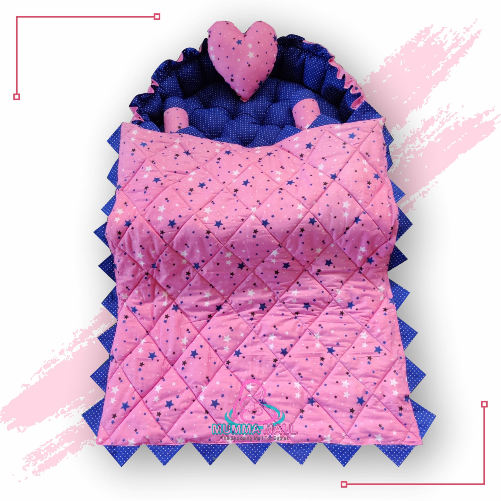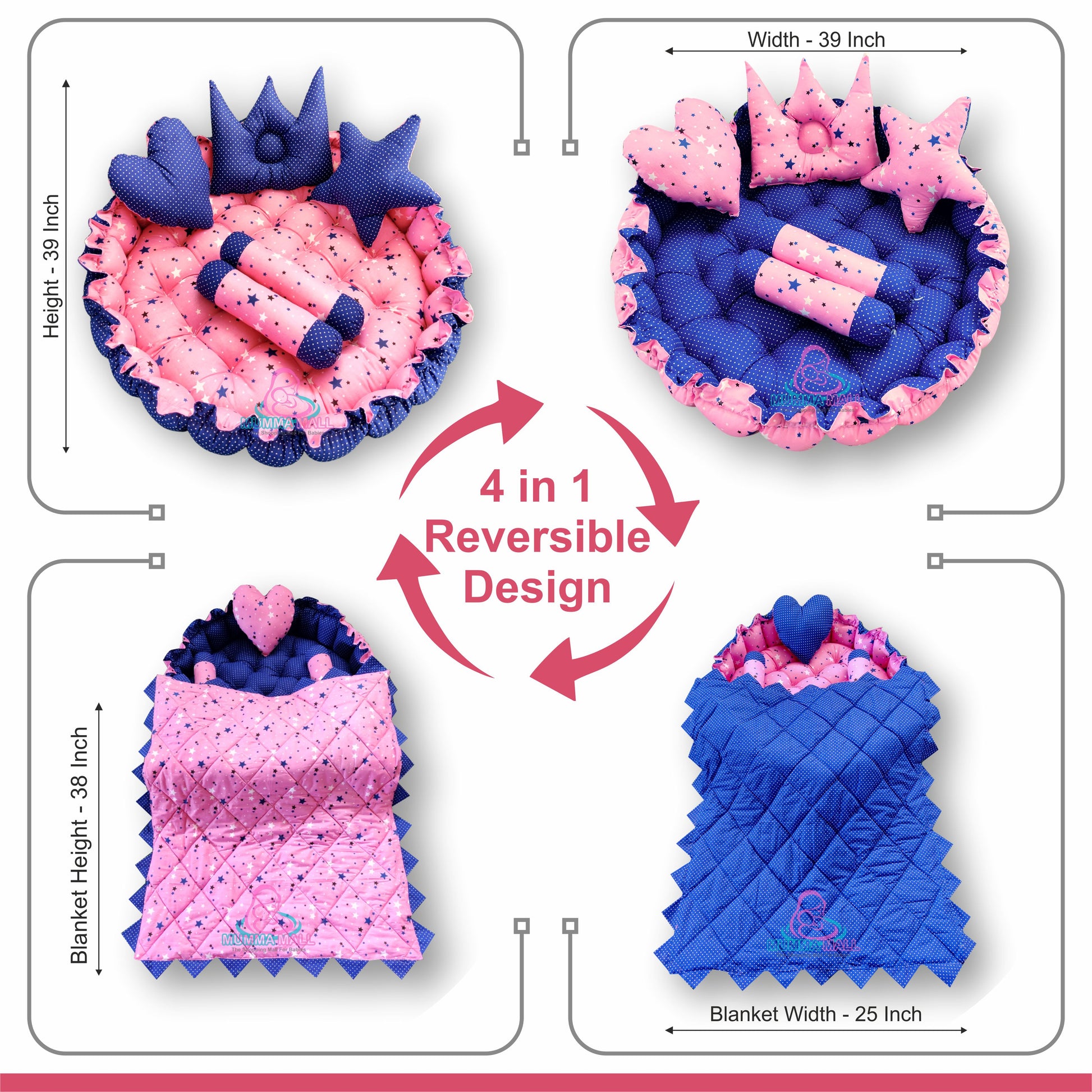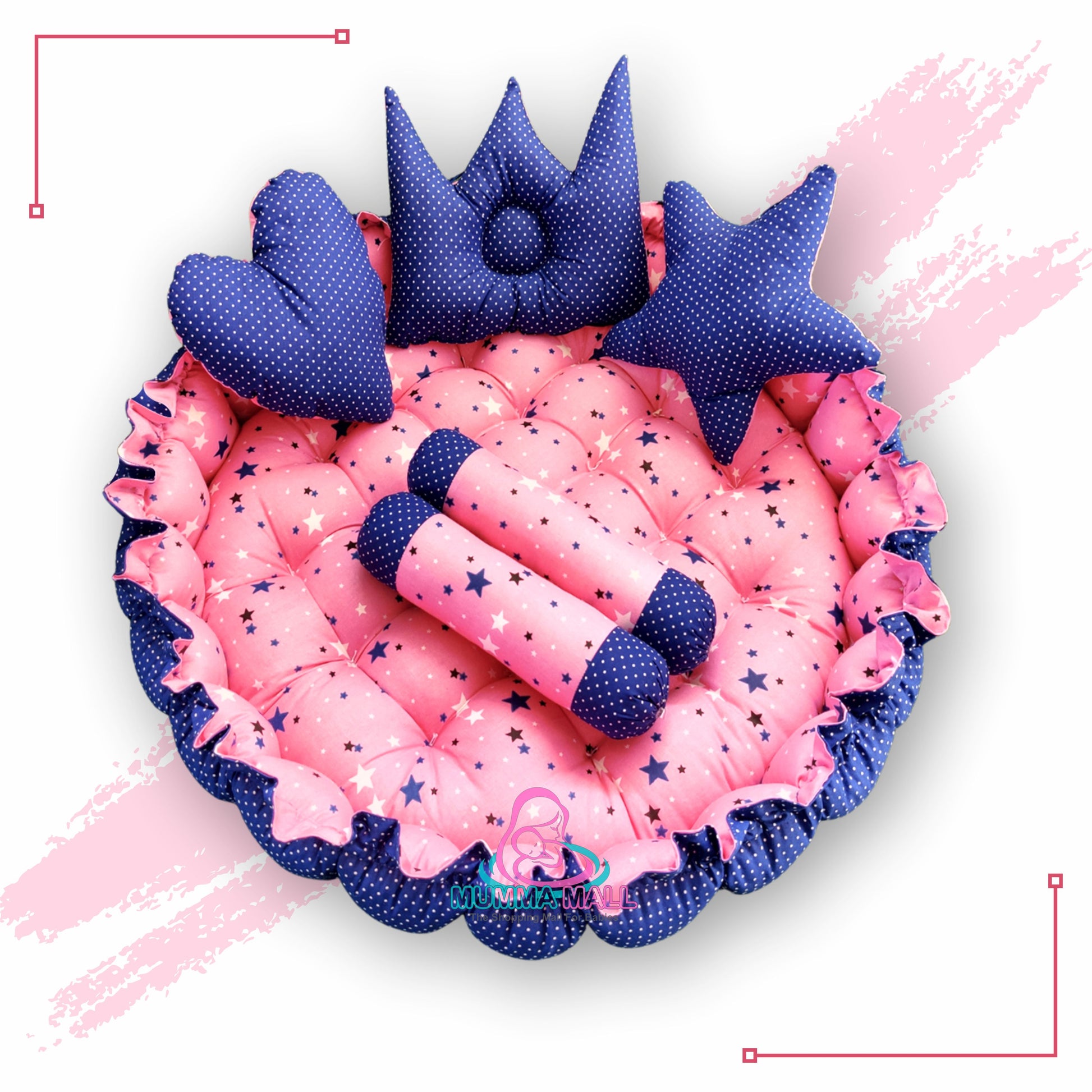 Round baby tub bed with blanket and set of 5 pillows as neck support, side support and toy (Pink and Blue)