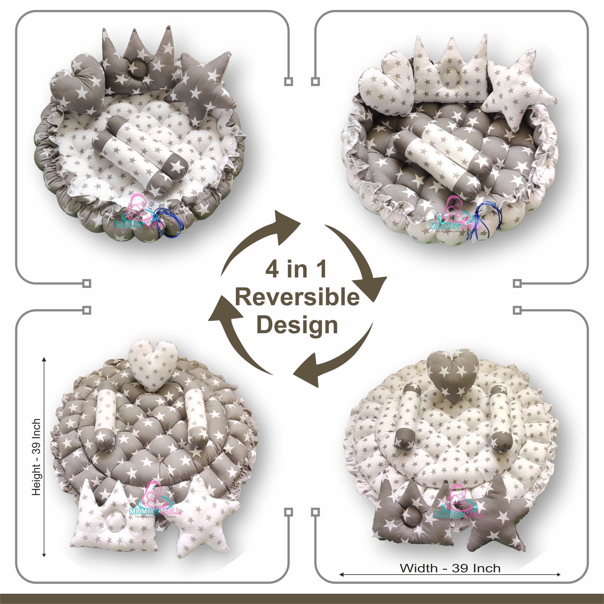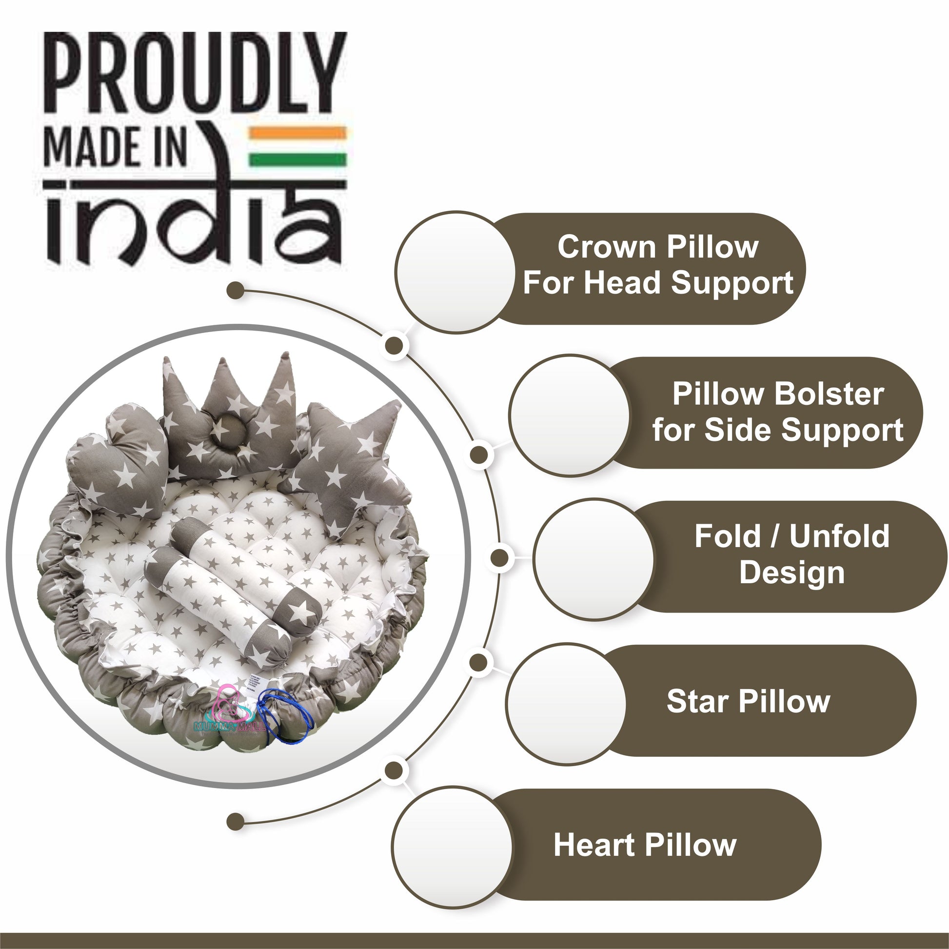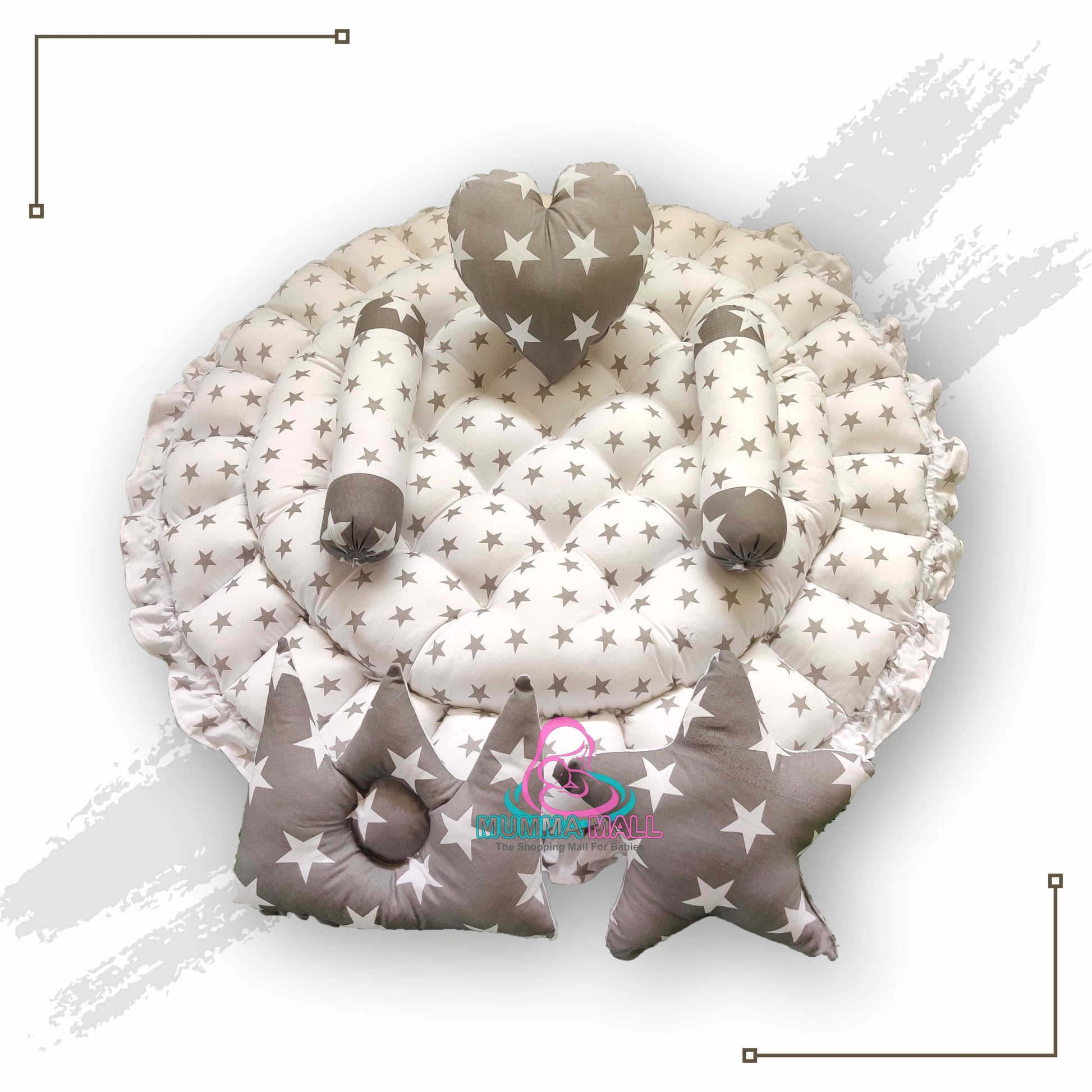 Round baby tub bed with set of 5 pillows as neck support, side support and toy (Grey and White)