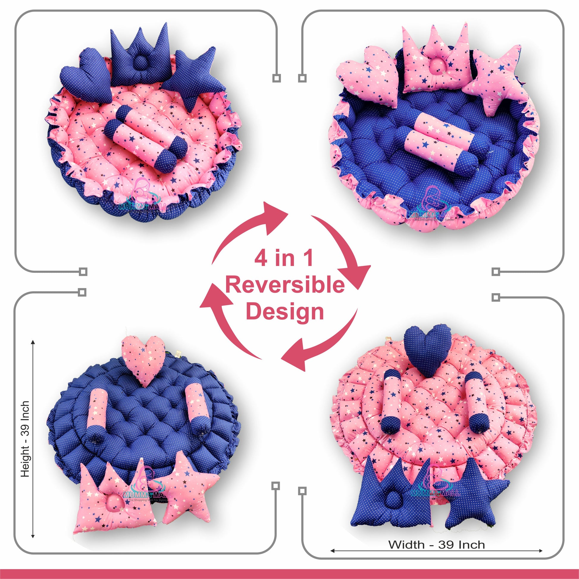 Round baby tub bed with set of 5 pillows as neck support, side support and toy (Pink and Blue)