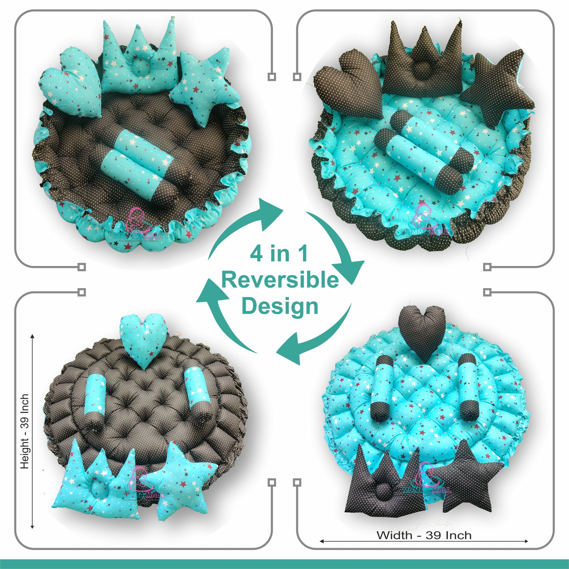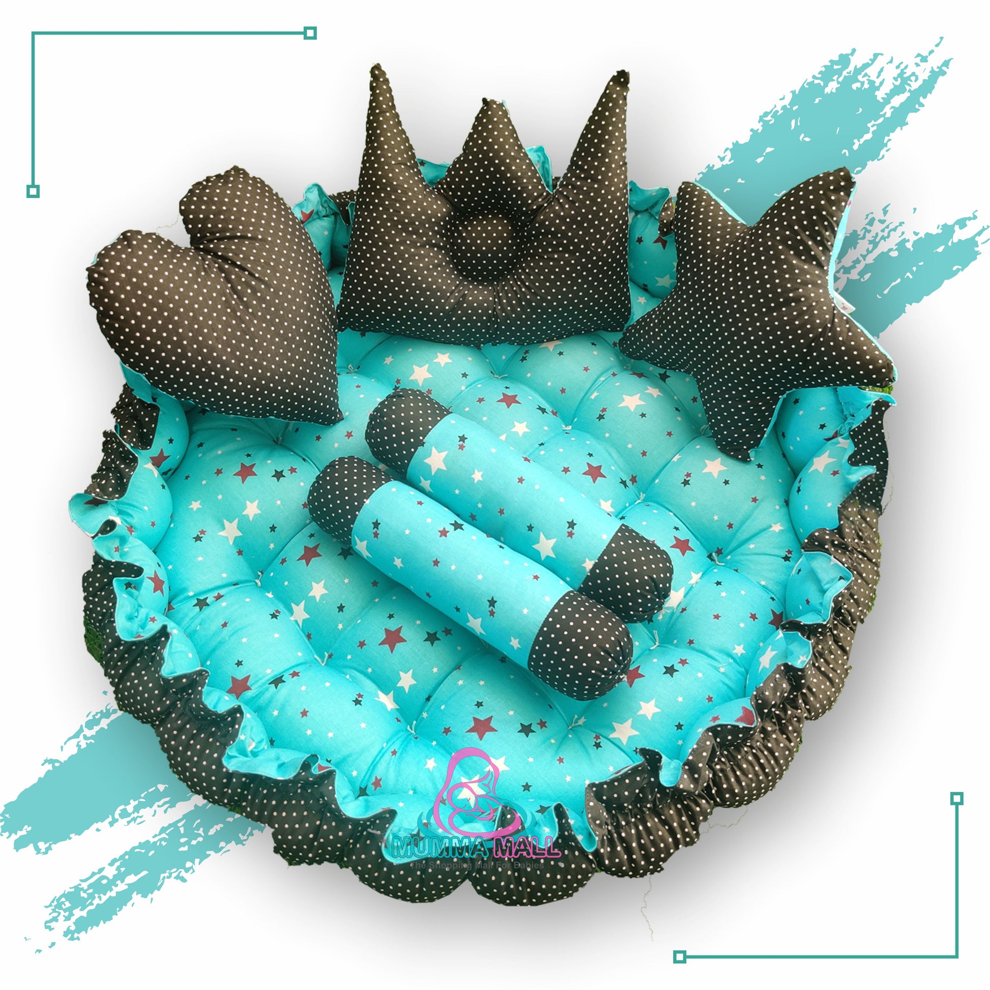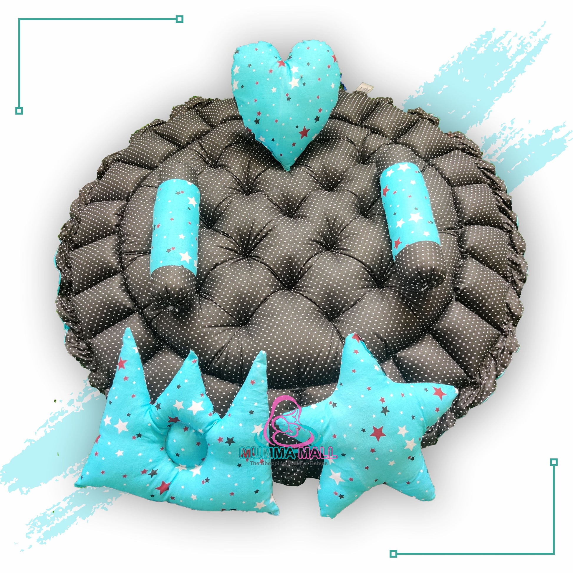 Round baby tub bed with set of 5 pillows as neck support, side support and toy (Turquoise and Black)