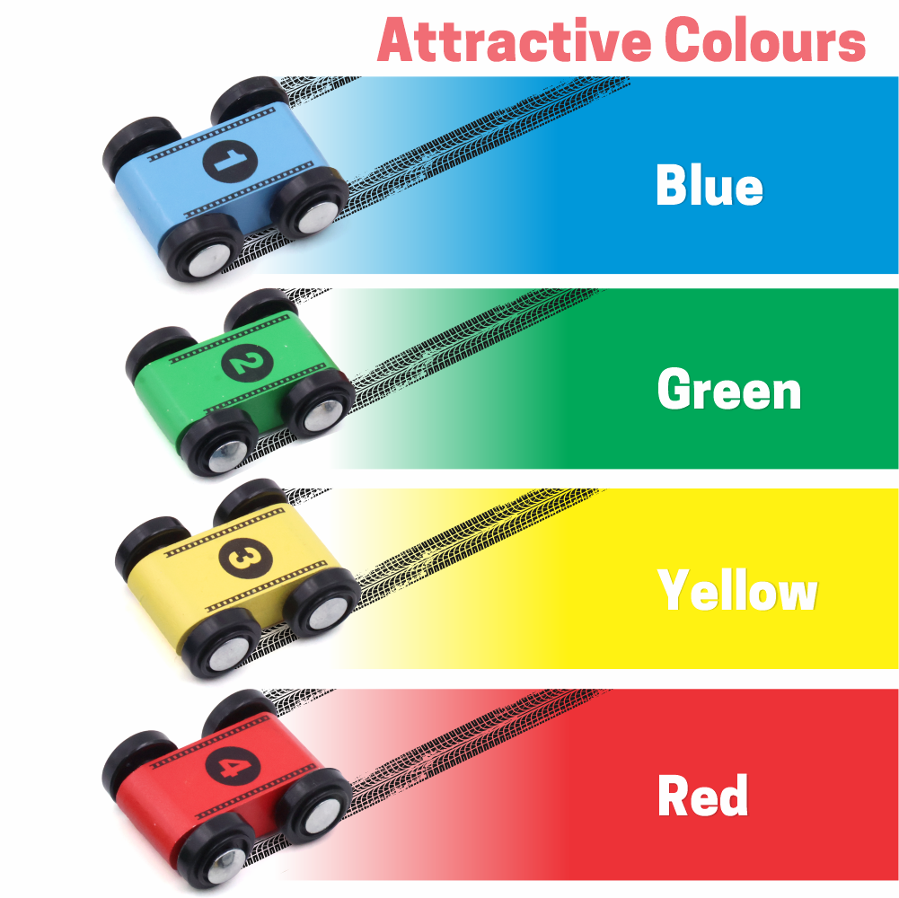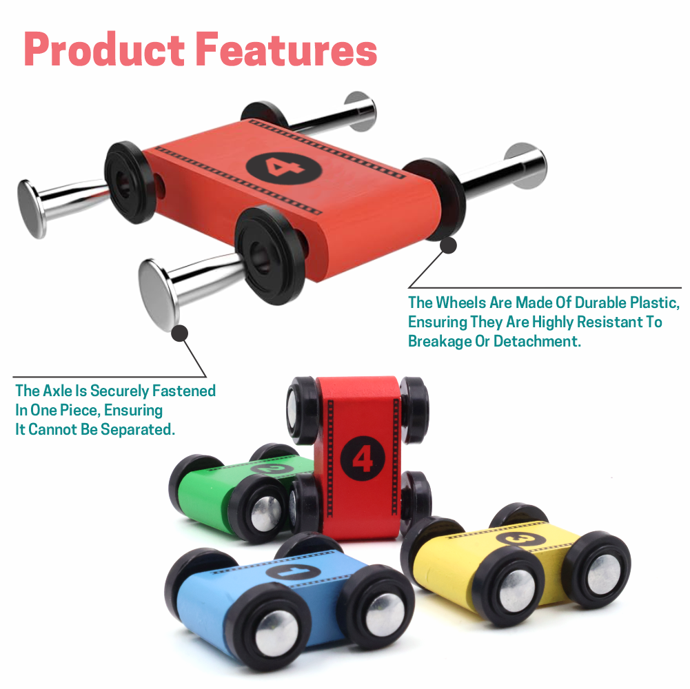 🏎️ Set of 4 Mini Wooden Cars: Includes four robust wooden mini cars, each associated with a colour and number, promoting colour recognition and logical thinking skills in children.